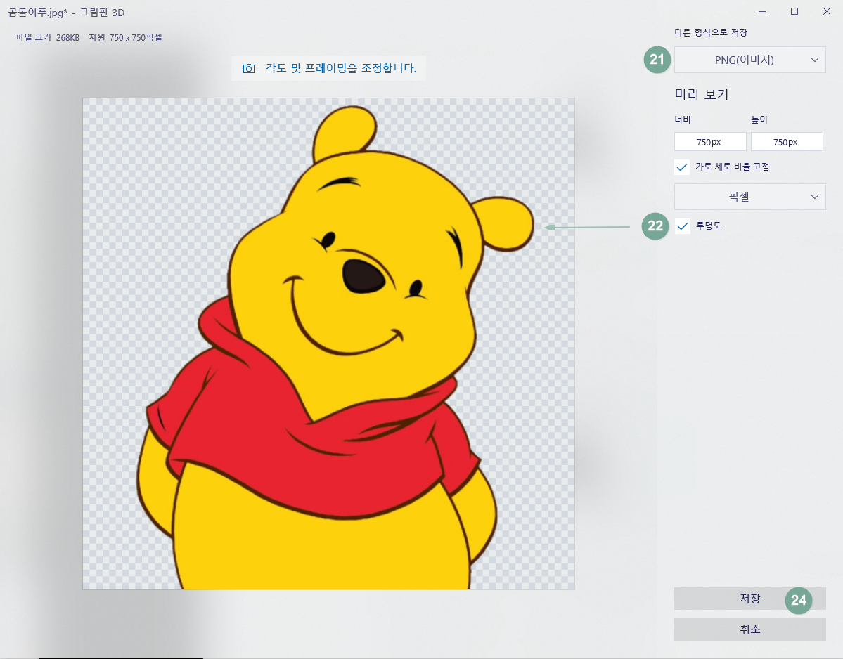 (22) 투명도에 Check 하시면, 배경이 투명으로 변경된 것을 확인할 수 있습니다.